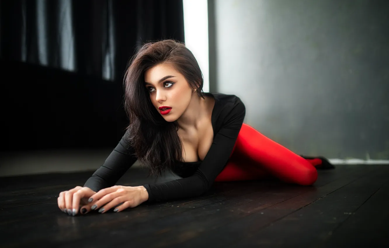 Обои девушка, поза, брюнетка, колготки, на полу, красная помада, Дмитрий Шульгин